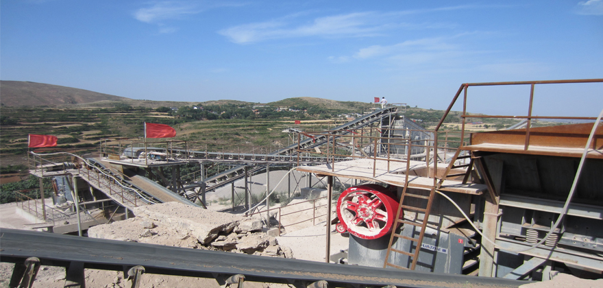 該系統(tǒng)示意工藝適用于時(shí)產(chǎn)300噸花崗巖、玄武巖類硬性物料的加工破碎,將經(jīng)過爆破處理或開挖、洞采的小于1100mm大塊毛料通過自卸車上料至原料倉,經(jīng)過具有預(yù)篩分功能的棒條給料機(jī)均勻的供給顎式破碎機(jī)破碎,經(jīng)顎式破碎機(jī)破碎后70-200mm的半成品物料通過皮帶機(jī)輸送給具有中細(xì)碎功能的圓錐破碎機(jī)進(jìn)行二次破碎,經(jīng)圓錐破碎機(jī)二次破碎后8-51mm的混合成品骨料經(jīng)過皮帶機(jī)輸送至后續(xù)一篩車間進(jìn)行分級(jí)篩分,篩分將大于用戶需要的大顆粒物料再通過皮帶機(jī)輸送至細(xì)碎圓錐破碎機(jī)進(jìn)行破碎,破碎后的物料也進(jìn)入一篩車間進(jìn)行篩分,滿足客戶需要的合格成品通過皮帶機(jī)輸送至成品料倉,不符合要求的大顆粒再次返回細(xì)碎圓錐破碎機(jī)進(jìn)行循環(huán)破碎。