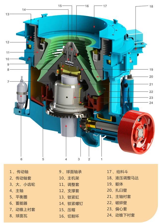 4.液壓馬達驅動調整套(定錐襯板),可對排料口進行準確調整,液壓馬達還可使調整套和定錐襯板全部轉出支撐套,以便更換定錐襯板和動錐襯板,從而大大簡化了襯板更換的工作量。