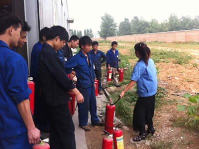 下午14:00,演習正式開始。首先是對員工消防意識的培養,公司從各部門選派的20名“消防隊員”認真觀看了《消防器材的使用方法及火災初期的撲救措施》和《洛陽東都商廈火災案例》2個視頻,這使員工從思想上更加重視消防安全并初步了解了消防器材的操作要點;接著,大家來到二號車間南側操場的演習現場,辦公室穆主任對滅火器的正確使用做示范演講之后,消防隊員拿起滅火器材沖向“著火點”進行“滅火”,僅幾分鐘時間,現場大火就被全部撲滅。