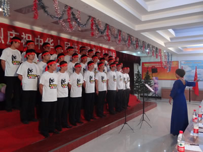此次歌詠比賽由辦公室穆云紅、供應部劉華賓主持,董事長苗三周、總經理張紅彥、副總經理程自強、副總經理郭學師、黨支部書記王獻宏、博林分廠經理蘆繼鋒、工會主席黃麗華擔任評委。“衷心祝愿偉大的祖國更加繁榮富強,祝愿我們公司興旺發達,祝愿……”在苗董事長的祝福聲中,比賽正式拉開帷幕。參賽選手們以抖擻昂揚的精神風貌,用高亢嘹亮的歌聲,或慷慨激昂,或深情豪邁,或樸實自然,或熱情奔放地將大華人對祖國的贊美與熱愛之情融入到每一首歌曲中,《走向復興》、《永遠不回頭》、《中國人民解放軍進行曲》、《國家》、《保衛釣魚島》等等,一首首膾炙人口的經典革命歌曲,掀起了一個又一個高潮,充分表達了大華人振興中華、富國興企的堅定信心與決心。