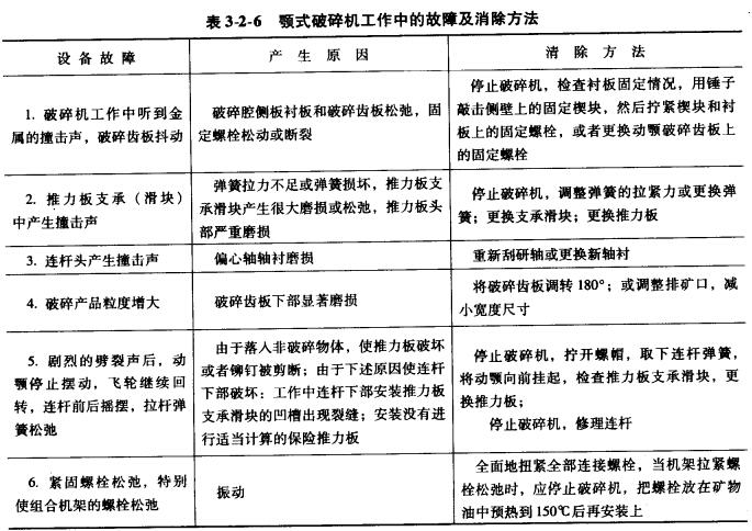顎式破碎機常見的設備故障、產生原因和消除方法列于下表中。