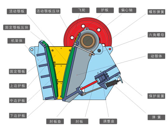 顎式破碎機的破碎腔是由固定顎(即機架的前壁)和動顎所構成。固定顎板和可動顎板都襯有錳鋼制成的破碎板和破碎板用螺栓分別固定在機架的前壁上和動顎上,為了防止碎礦時在襯板表面產生的摩擦力剪斷襯板固定螺栓,動顎襯板下端支承在動顎下端凸臺上,上端用楔塊壓緊。而定顎襯板下端支承在焊于機架上的鋼板上,上端用鋼板壓緊。為了提高破碎效果,兩破碎板的表面部帶有縱向波紋,而且是凸凹相對。這樣,除了對礦石有壓碎作用外,還有彎曲作用。破碎機工作空間的兩側壁上也裝有錳鋼襯板。