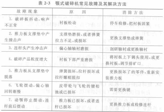顎式破碎機在工作中較常見故障及其解決方法列入表2-3中。
