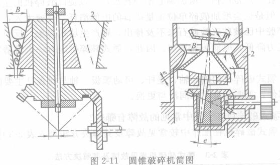 圖中1為動(dòng)錐,2為固定錐。它們之間的空間為破碎腔,電動(dòng)機(jī)通過皮帶帶動(dòng)圓錐齒輪,由于偏心機(jī)構(gòu)的作用,使動(dòng)錐的錐面周期地靠近與離開固定錐面。當(dāng)動(dòng)錐靠近固定錐面時(shí)產(chǎn)生破碎作用,離開時(shí)物料就從破碎腔排出。可見,圓錐破碎機(jī)的工作原理與顎式破碎機(jī)相同,可以看作是連續(xù)作用的顎式破碎機(jī)。圓錐破碎機(jī)在破碎時(shí)除了有擠壓力外,還兼施彎曲力,所以破碎能力強(qiáng)。加之其具有連續(xù)作用,因此生產(chǎn)率也較高。