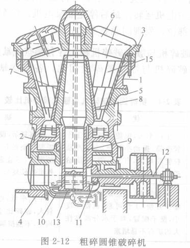 粗碎圓錐破碎機(jī)(旋回破碎機(jī))的剖面圖如圖2-12所示。