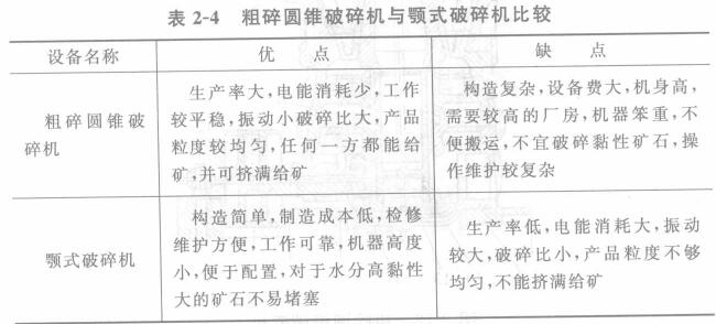 粗碎圓錐破碎機(jī)與顎式破停機(jī)相比,各有優(yōu)缺點(diǎn),見表2-4所列。