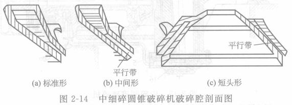 除了標(biāo)準(zhǔn)型與短頭型圓錐破碎機(jī)外,還有介于它們兩者之間的一種名為中型圓錐破碎機(jī).既可用于中碎也可以用于細(xì)碎。標(biāo)推、中性、短頭圓錐破碎機(jī)的主要區(qū)別是破碎腔的斷面形狀不同。因此,給礦粒度和排礦粒度也不同。圖2-14表示了這三種破碎腔剖面圖。