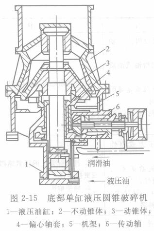 圖2-15為底部單缸液壓圓錐破碎機(jī)構(gòu)造圖??蓜?dòng)錐體3的主軸下端插入偏心軸套4中,并支撐在油缸活塞上面的球面圓盤上,活塞下面通入高壓油用于支撐活塞。由于偏心軸套的轉(zhuǎn)動(dòng),從而使動(dòng)錐體作錐面運(yùn)動(dòng)。