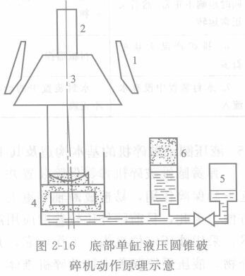 底部單缸液壓圓錐破碎機(jī)動(dòng)作原理如圖2-16所示。