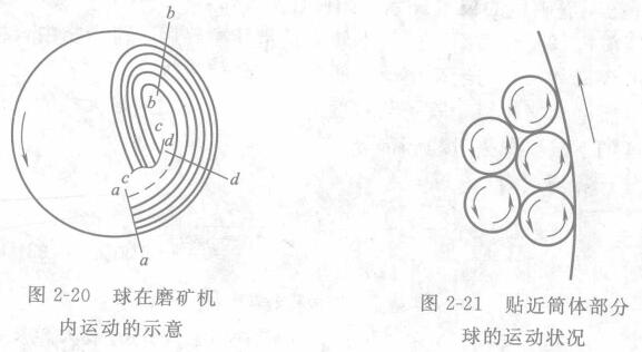 圖2-20與圖2-2l表示磨礦介質(鋼球)在磨機筒體內的運動情況。由于鋼球與筒體之間有摩擦力,當筒體旋轉時,鋼球即被帶起并升到一定高度(圖2-20 aa—bb區域),由于鋼球本身的重力作用,最后沿一定的軌道下落(圖2-20 dd-cc區域)。在aa-bb區域內(鋼球被帶上)的鋼球受到兩種力的作用:一為筒體旋轉時自切線方向施于鋼球的作用力(圖2-21所示);另一為與鋼球直徑相對稱一面而與上述作用力相反的力,這個作用力的產生是由于鋼球本身自重而向下滑動所引起的。因此,上述兩種作用力,對于任何一個鋼球都會構成一對力偶。并且由于鋼球是被擠壓在筒體與相鄰鋼球的中間,所以力偶會使鋼球發生自轉。此外,出于筒體與最外層鋼球之間以及各層鋼球彼此之間都存在大小不等的摩擦阻力,因而各層鋼球將隨筒體繞筒體軸心作公轉運動(當然,各層球并不與筒體有同步速率,同時各層鋼球的公轉速度也不一樣)。在aa-bb區域內的所有鋼球均有自轉和公轉兩種運動,而在bb-cc區域內鋼球自上而下拋落,因而在cc區域里對筒體內的礦石發生強烈的沖擊破碎作用。由于鋼球下落時產生沖擊力,因而在aa-cc-dd區域內鋼球產生極為強烈而無秩序的運動。其中包括:①點線上方鋼球的強烈滾動;⑦沿點線處鋼球的快速移動;③點線下面鋼球隨磨機筒體的快速移動;④各層鋼球之間的互相沖擊??梢姡琣a-cc-dd區域即是磨礦作用最強烈的地方。大部分粗礦粒在這單得到磨碎。