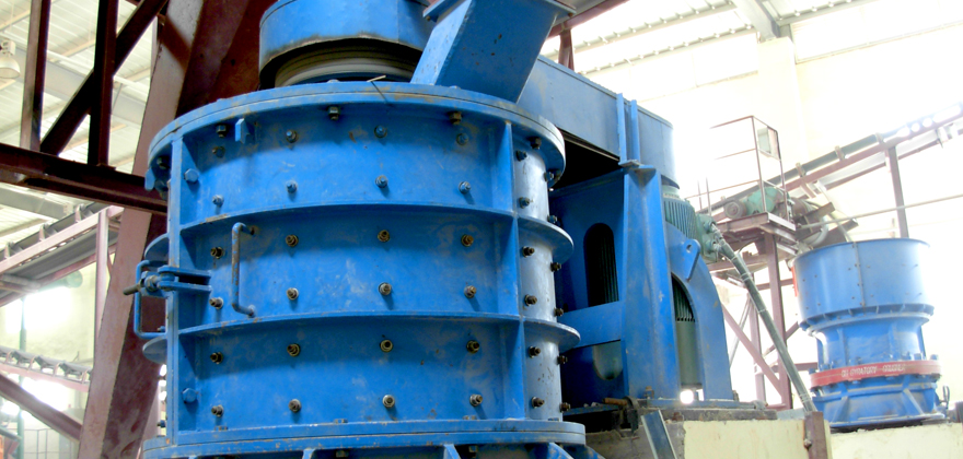 當物料從進料斗落入圓柱形機體之后,首先受到第一轉子上板錘的沖擊,并以很高的速度沿轉子切線方向被拋向反擊板產生撞擊,物料在反擊板上的斜齒齒面及重力作用下,又沿斜下方向反彈到轉子體外圓周與反擊板之間(即破碎腔),物料再次受到急速旋轉的板錘沖擊后又被拋向反擊板,并繼續重復該過程。由于物料在破碎腔內受到板錘和反擊板的周而復始的沖擊以及料塊之間的相互撞擊,致使物料沿其自然節里面、層里面發生碎裂。當破碎后的物料粒度小于第一級轉子的排料間隙時,物料在重力作用下進入到第二級轉子的破碎腔。第二級破碎過程與第一級相同,所不同的是第二級轉子的線速度比第一級更高,物料所受到的沖擊更大,因此可使物料破碎的更細小。當物料破碎到最終的產品粒度后,便從卸料斗排出。較大型一般有三級破碎,有三個轉子。